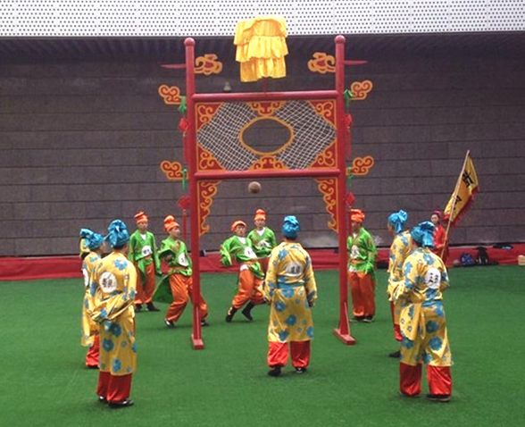 唐代的球体轻了,可以踢高。球门就设在两根三丈高的竹竿上,称为“络网为门以度球”。在踢球方法上,汉代是直接对抗分队比赛,“僻脱承便,盖象兵戍”。双方队员身体接触就象打仗一样。唐代分队比赛,已不是直接对抗,而是中间隔着球门,双方各在一侧,以射门“数多者胜”。从足球技术来说,是一种发展:而间接对抗,从体力训练来说,却是足球运动的一个退步。