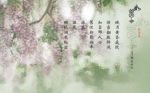 纤月黄昏庭院,语密翻教醉浅,知否那人心?旧恨新欢相伴。
