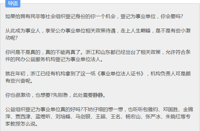 浙江他们意识到了一个问题,在现行的法律框架下,民办非企业单位和事业单位在法律地位上是不同的,就导致了很多不平等,所以浙江的做法是想把它拉平,拉平的办法是把具备条件的民非纳入到事业单位这个大的概念里面。
