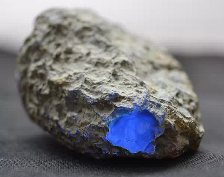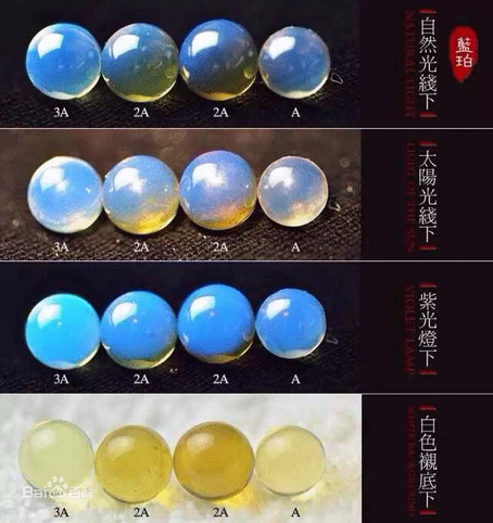 天空蓝及蓝紫是多米尼加蓝珀特有的颜色。在波长380-450nm的长波紫外线下会出现强烈的白蓝色Milky Blue萤光反应。这个方法直接点明了蓝珀神秘色彩的核心,因为这种琥珀中含有一种特殊物质“多环芳香分子”poly-nuclear aromatic molecules-蒽Anthracene这种暗藏在蓝珀内的“光感物质”,在受到外界的特定“入射光”照射激发后,吸收光能再释放出属于可见光范围的萤光(注),也就是我们肉眼所看见的蓝、绿或紫光。蓝色琥珀的奇特之处在于颜色变化多端,就好似调色板上的颜料以蓝色为基调,可恣意调配出浅蓝,深蓝,天蓝,紫罗蓝,海水蓝,湛蓝,红蓝,黄蓝,绿蓝等十多种以上的色彩变化,有时甚至在同一块蓝珀原矿中便可见到三种以上不同的“蓝”。