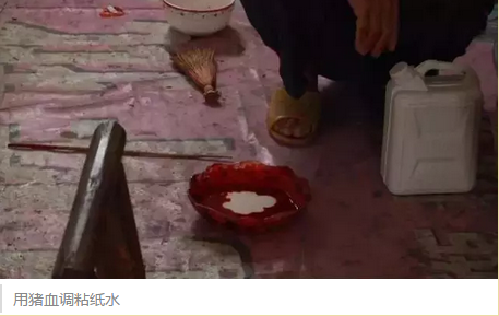 “一斤猪血放八两水,要温水,冷水不行,热了也不行。再放石灰,没有石灰就不得,放其他的也不得,(要不涂在伞纸上就不粘。)这个是秘密,不传的。”