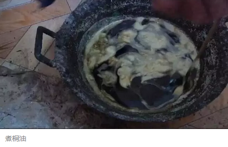 “这个秘密我就告诉你啦,(用)这个煮(桐)油,拉丝这么长就放,一放下去就不能着火了。放多少要看气候,水风天就多放一点,干风天就放少一半。”