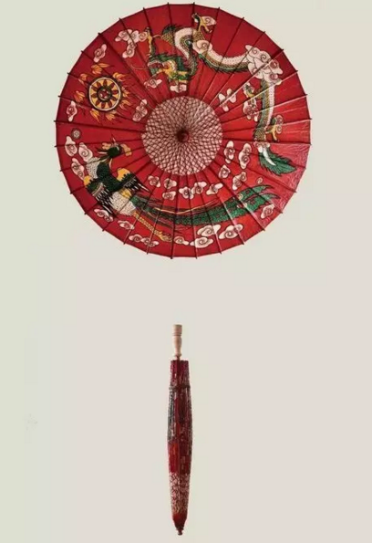 四川油纸伞起源于明末清初,有四百多年历史,以泸州分水油纸伞为代表。此伞伞面采用传统石印工艺,绘有“龙凤呈祥”图。龙凤常被作为中华文明的象征,是最受崇尚的吉祥图饰。《诗经·文王之什》中有龙氏族王季娶凤氏族鸷仲氏的记载。所以龙凤呈祥,寓意夫妻间比翼双飞、恩爱相隨、相濡以沫、百年好合。