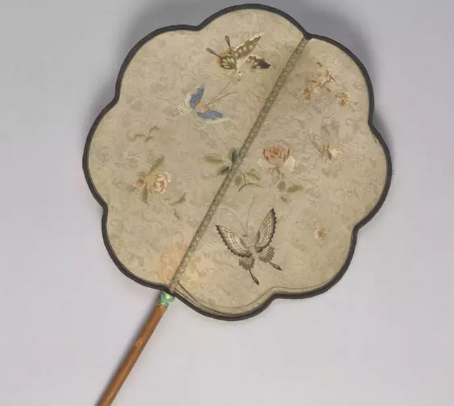 白绢地绣孔雀漆柄团扇