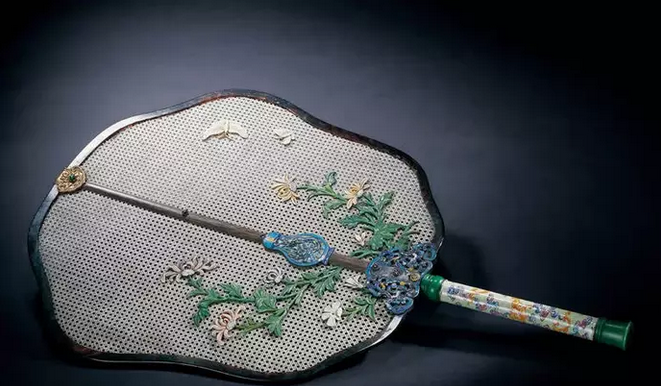 象牙丝编织菊蝶图画珐琅柄宫扇