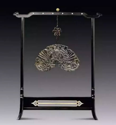 37.磬,古代打击乐器,形状像曲尺,用玉、石制成,可悬挂,可赏可奏。图为刻龙纹玉磬边架。