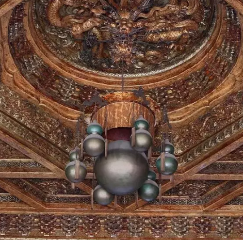 44.轩辕镜,古镜名,古人谓用之辟邪,其形如球,主要悬挂在卧榻前。图为故宫太和殿龙椅正上方有“盘龙藻井”,藻井上雕刻着一条龙,龙嘴下面叼着一个晶亮的圆球,即为“轩辕镜”,传说它是中国古代祖先“轩辕氏”制造的,可以分辨真假天子。现在城市广场中有些地方,也有各种圆球,类似“轩辕镜”的功能。