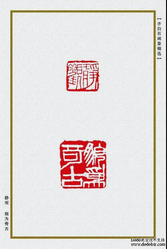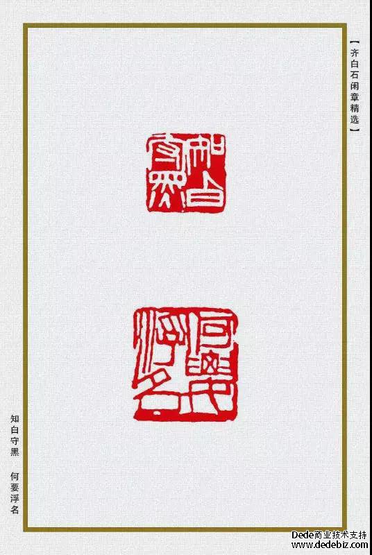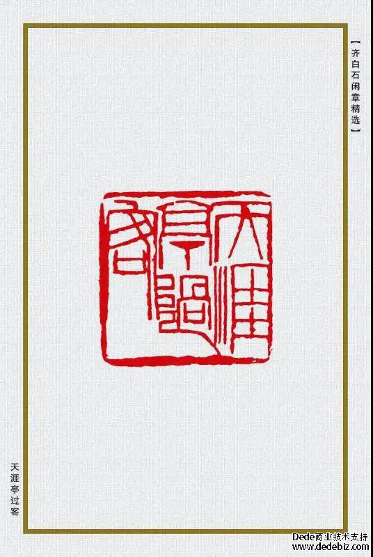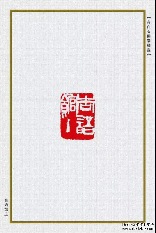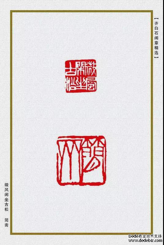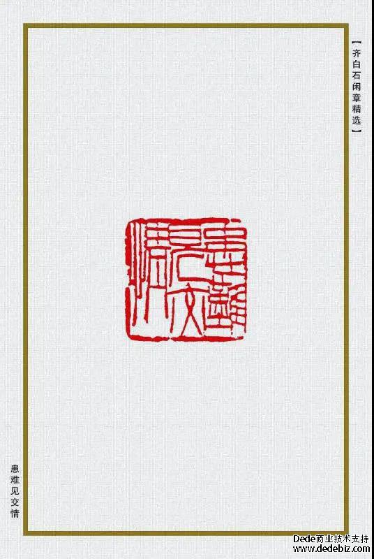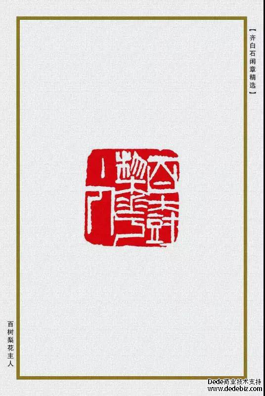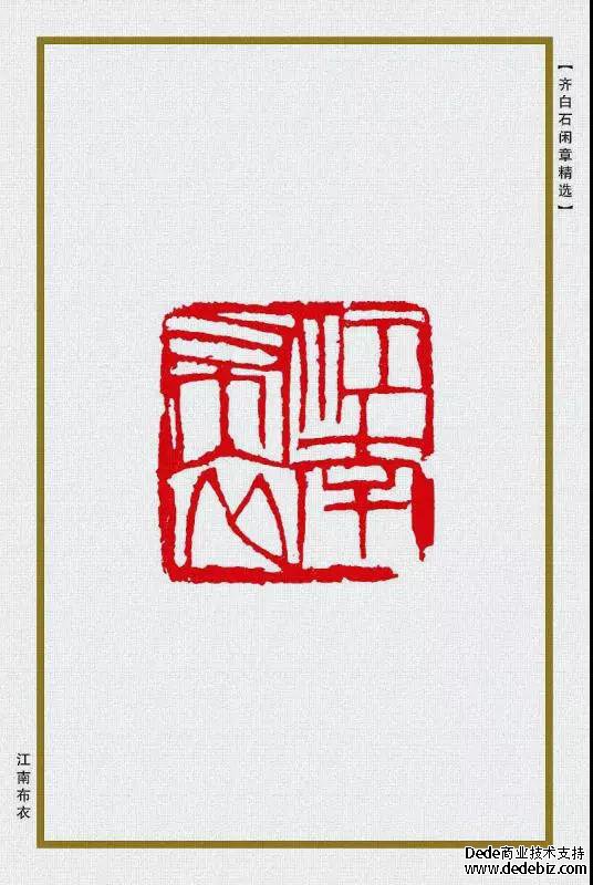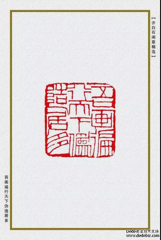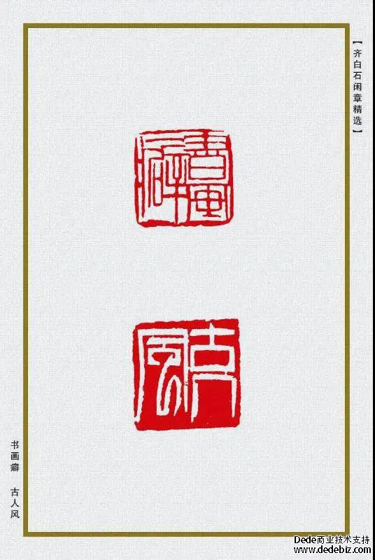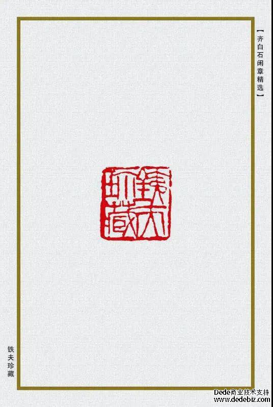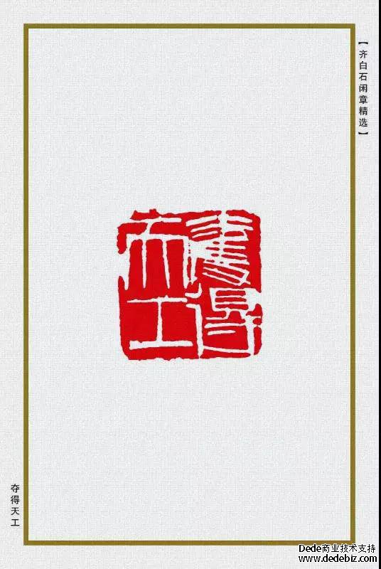 白石老人将汉印中平正方实,转折圆而结体方的构图特点加以变化,使一字之内,外形方正,而笔意疏密参差变化生动,穿插自然而恣肆纵横,使章法在强烈的对比中得到统一。他还将篆书上密下疏的特点移人印章,大胆变革而不失法度。齐白石治印,强调不削不作,绝摹仿,恶整理,主张率真自然。