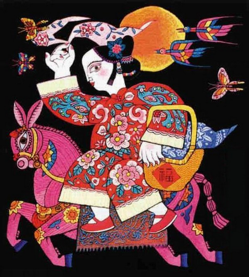鲁绣从古代帝王公卿的章服走入寻常百姓家,无论是邹县1350年李裕庵墓葬中沉睡的绣裙、袖边、鞋面采用的山东传统“衣线绣”,所表现出图案苍劲粗犷、质的(地)坚实牢固;还是存于故宫博物院中的明代作品《文昌出行图》、《芙蓉双鸭图》所表现出的用色鲜明、针法豪放、朴实健美,都向世人展示出鲁绣绣饰鲜明而不脱离实用的汉族传统艺术风格。