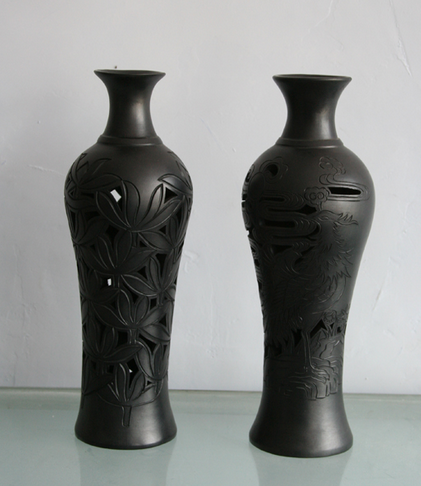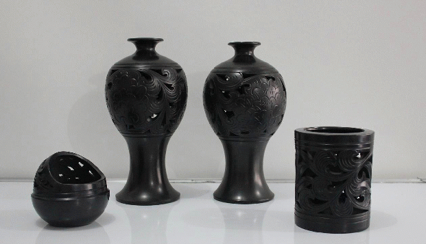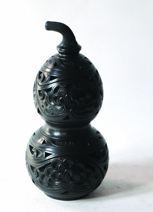 在烧制上,则重点采用传统技术与现代技术结合的循序升级渗炭法,使产品达到通体透黑,产品黑度越高,表面越亮,充分展现黑陶的特色。