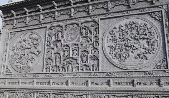 在青砖上雕刻出人物、山水、花卉等图案,是古建筑雕刻中很重要的一种艺术形式,主要用于装饰寺塔、墓室、房屋等建筑物的构件和墙面。粉墙上饰以砖雕、石雕花窗,或放长条石桌、石凳,点缀小品,使建筑、山水、花木融为一体,庭院小,颇得园林之趣。