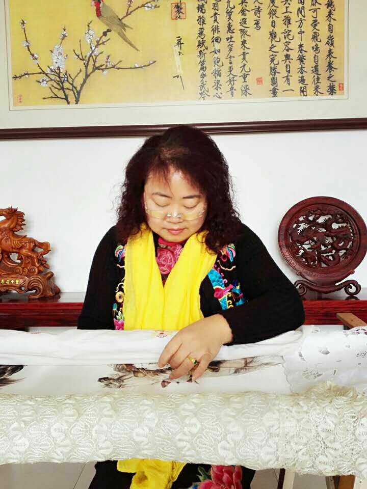 刘振兰 :山东济南人。中国华侨艺术研究院刺绣艺术主任,山东弘正传统文化研究院工艺美术委员会副主任,高级研究员,山东省工艺美术协会会员,济南市工艺美术协会会员。其自幼受家传影响,开始接触刺绣,又师从苏绣沈寿第四代传人濮惠菊大师学习技艺。在日常创作中,潜心研究,大胆创新,在技法和材料上敢于尝试。从改变发绣材料,到用缎面和生丝纱做底料。并选用上好发质,将其染制、软化、处理,在作品中尽量使用自然色绣制,使作品更加接近原作。如《盛世八骏》《牧童图》《雄鸡图》。作品《摩天振羽》就是利用了发丝绣“色中有墨,墨中有色”的特点,并充分运用发丝绣中的滚针、韵针、渗针、接针、齐针、缠针、虑针等多种不同针法,突出表现作品中鹰的霸气与威风。该作品大气磅礴,气势如虹。形成一种独有的发丝绣笔墨丹青。刘振兰在多年创作中逐渐形成了自己的刺绣艺术风格,纵观其作品精致、雅洁、柔丽。《摩天振羽》《鹊华秋色图》《柳蝉图》《八骏图》《双骏图》《竹笋图》《寒雀图》等多幅发丝绣刺绣作品,在2014年在传统工艺美术作品获创新奖。2016年淄博工艺美术博览会获金、银奖。第四届中国非物质文化遗产博览会(山东赛区)金奖。2017年第九届中国(山东)工艺美术博览会荣获金、铜奖。 其作品被国内外多家文化机构收藏。