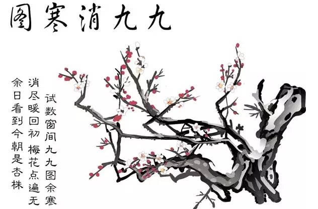 冬至的次日开始数九,这就是人们所说的"提冬数九"。数上9天是一九,再数9天是二九,以此类推,数到"九九"就算"九"尽了。"九尽杨花开",那时天就暖了。入九以后,文人墨客,搞所谓消寒活动,择一"九"日,相约九人饮酒("酒"与"九"谐音),席上用九碟九碗,成桌者用"花九件"席,以取九九消寒之意。