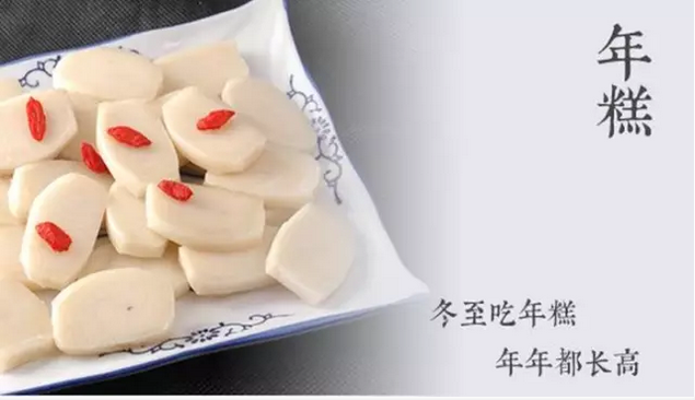 吃年糕从清末民初直到现在杭州人在冬至都喜吃年糕。在每逢冬至做三餐不同风味的年糕,早上吃的是芝麻粉拌白糖的年糕,中午是油墩儿菜、冬笋、肉丝炒年糕,晚餐是雪里蕻、肉丝、笋丝汤年糕。冬至吃年糕,年年长高,图个吉利。