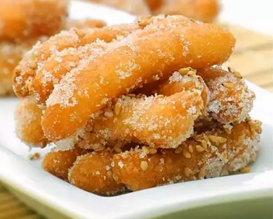 谁小时候没吃过这个?江米条,越吃越香,越吃越想吃。属于逢年过节每家必备糕点了!用糯米面加豆粉和面后在焖锅里蒸出来,放在石臼里用棒子捶,再擀成圆形,晒干用油煎,蘸糖、芝麻等制作而成。