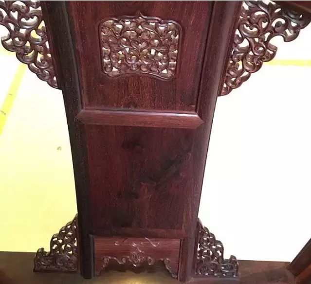 第四招:后腿一木连做,四腿弧度适中。皇宫椅的后腿应该是一块木料挖成,并且四腿要保证一定的外弯弧度,所谓“膨牙鼓腿”,说的就是这里。现在材料稀缺的情况下,很多皇宫椅后腿的牙花与腿子并非一木,而是另开榫相接,这样工人直接将腿削出,然后用楔子将牙板相连,做起来是很容易的。但如果采用一木连做,整条椅腿背面的多余用料都要手工凿掉,且牙花部分雕刻起来难度很大。可以说,不采用一木连做的椅子在做工上,比一木连做的,要省5倍以上。