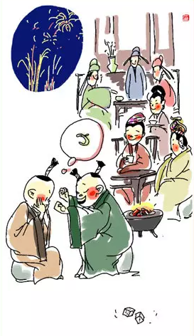,金吠报春。亲眷人家去拜年,东家留吃饭、西家排酒筵。