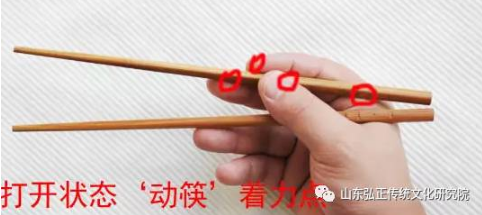 静筷在虎口内侧,以虎口正中、母指第二指节、无名指指端为三个着力点,相对静止的把握在手上,动筷在虎口外侧,以虎口中正外侧一指宽处、母指前端第一指节中间、食指前端内侧、中指前端为四个着力点。